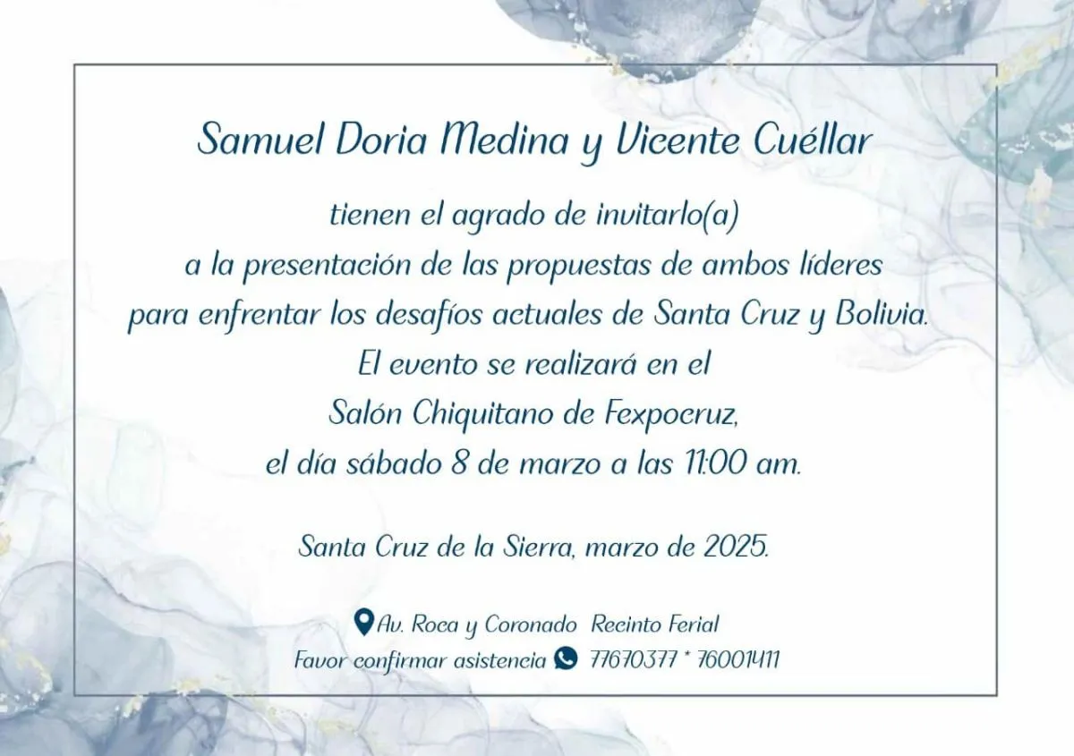 Los supuestos cuestionamientos giran en torno a la presentación de los planes de Gobierno anunciado por Doria Medina y Cuellar, quienes invitaron a una conferencia de prensa para el próximo sábado, en uno de los salones de la Fexpocruz.