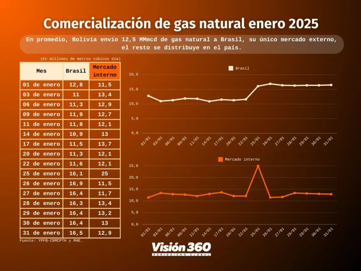 “La comercialización de volúmenes de gas natural al mercado de Brasil registró un promedio mensual de 12,8 MMmcd en enero de 2025, reflejando una disminución del 12% en comparación con diciembre de 2024”, resalta el informe.