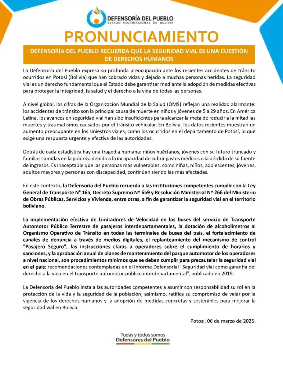 En este contexto, la Defensoría del Pueblo recordó a las instituciones competentes cumplir con la Ley General de Transporte N° 165, el Decreto Supremo Nº 659 y la Resolución Ministerial Nº 266 del Ministerio de Obras Públicas, Servicios y Vivienda, entre otras, a fin de garantizar la seguridad vial en el territorio boliviano.