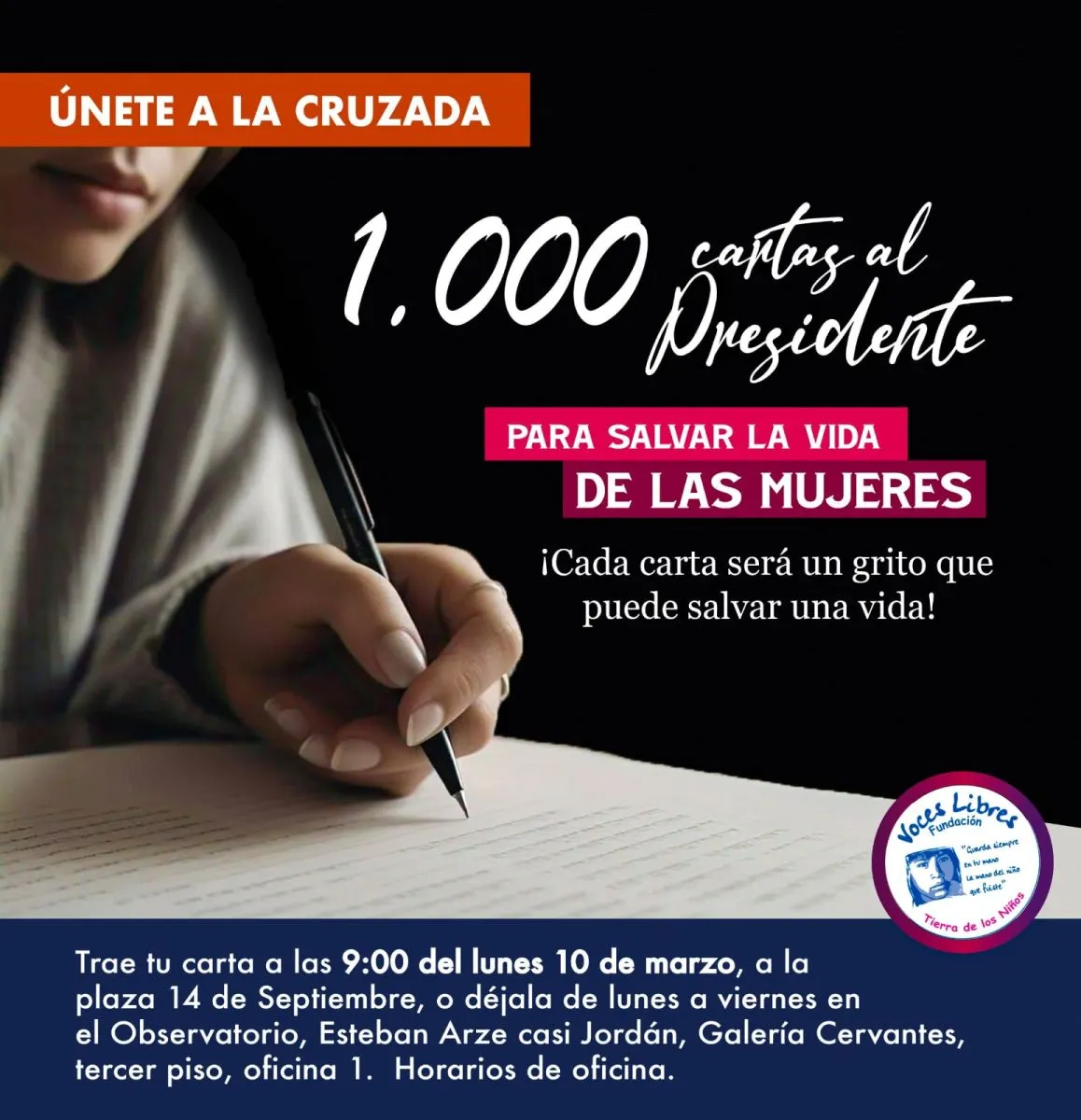 Con el fin de que el Presidente, Luis Arce, escuche el reclamo,  La fundación Voces Libre convoca  a la población a escribir 1.000 cartas en las que se exija la restitución del presupuesto destinado a la lucha contra la violencia de género. El lunes 10 de marzo se reunirán las primeras 100 cartas en la plaza 14 de Septiembre.