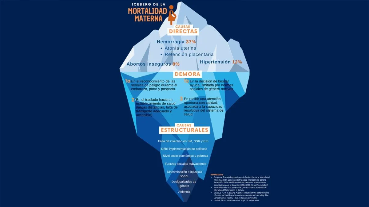 El Estudio Nacional de Mortalidad Materna Bolivia (2011) identifica que el 68% de las muertes maternas son de mujeres indígenas, lo que subraya las disparidades en el acceso a servicios de salud y la calidad de la atención, especialmente para las poblaciones más vulnerables. A su vez, precisa que entre las principales causas de la mortalidad materna en el país, se encuentra la hemorragia (37%), la hipertensión (12%), los abortos inseguros (8%) y las infecciones (5%). Sin embargo, la realidad es aún más compleja y, muchas veces, sólo se ve la "punta del iceberg". Detrás de cada muerte materna, existen barreras estructurales significativas que contribuyen a la tragedia. La distancia de las comunidades rurales a los centros de salud, la falta de transporte adecuado, y la escasez de personal capacitado son algunos de los factores que agravan las complicaciones durante el embarazo y el parto.