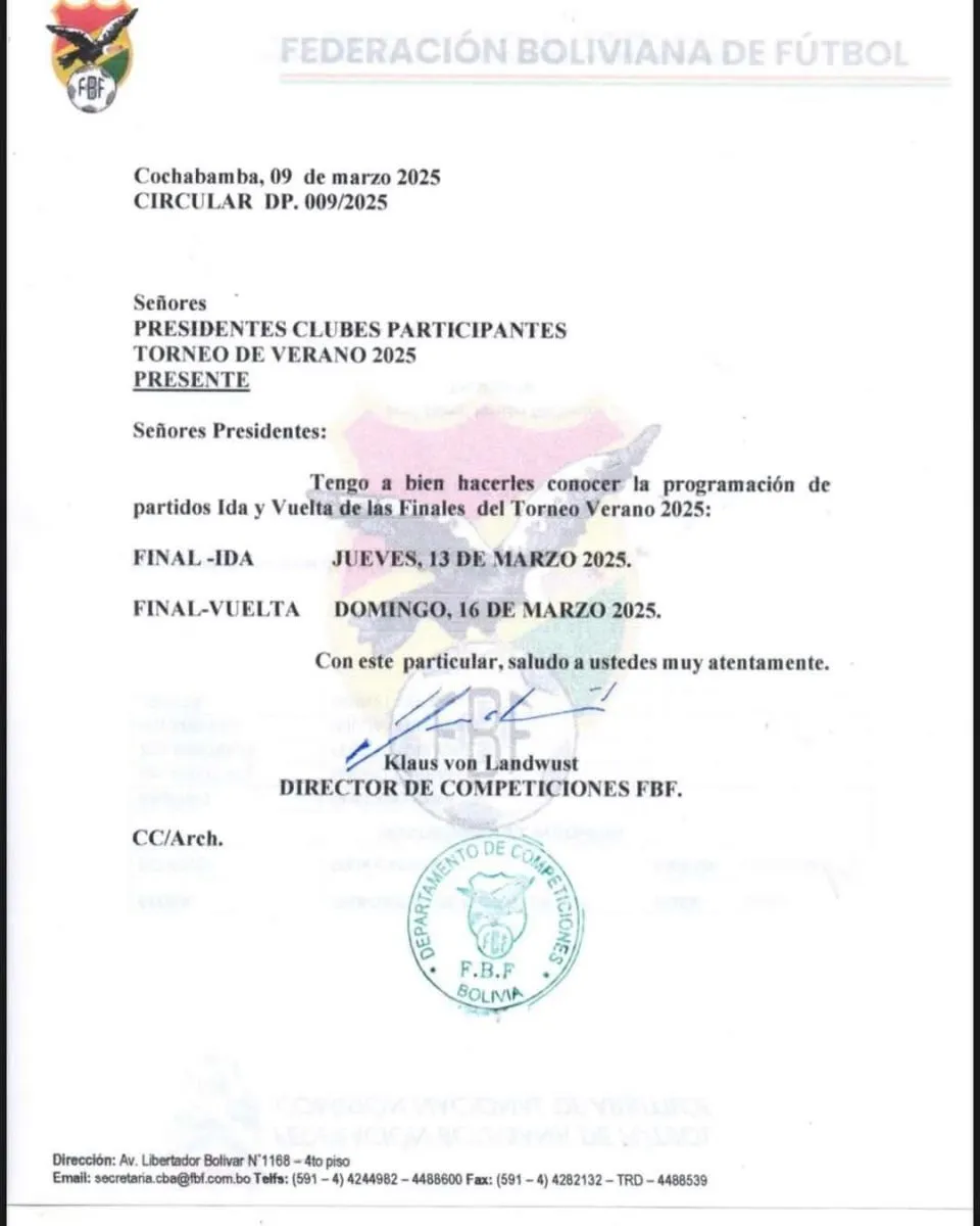 La finales del Torneo Amistoso de Verano se jugarán el jueves 13 y el domingo 16 de marzo, anunció la Dirección de Competiciones de la Federación Boliviana de Fútbol. Solo queda definir loas localias.