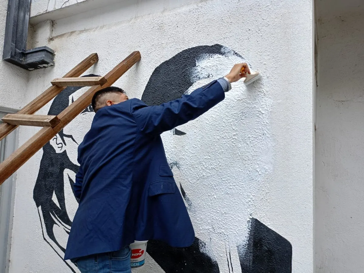 El diputado Cuéllar tapa con pintura blanca una imagen de Morales. Foto: Prensa diputado Cuéllar