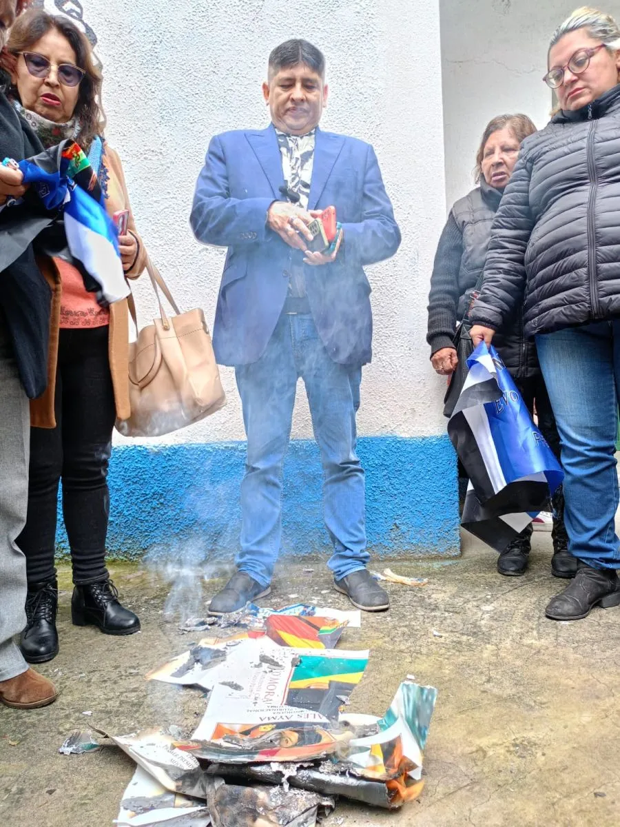 Momento en el que prenden fuego a los afiches que tenían la imagen de Morales. Foto: Prensa Diputado Cuéllar