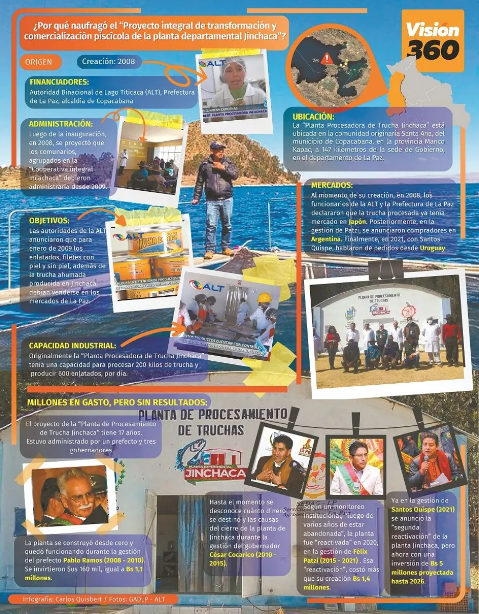 La “Planta de procesamiento de trucha”, en la estación experimental Jinchaca, a orillas del lago Titicaca en el municipio de Copacabana, que debía comprar la producción de peces a las comunidades, para procesar trucha ahumada, filetes y enlatados para “el mercado local e internacional”, naufraga en medio de informes contradictorios, que contienen “errores”, como lo admitieron los secretarios departamentales de la Gobernación de La Paz Celso Anaya y Hugo Aduviri.