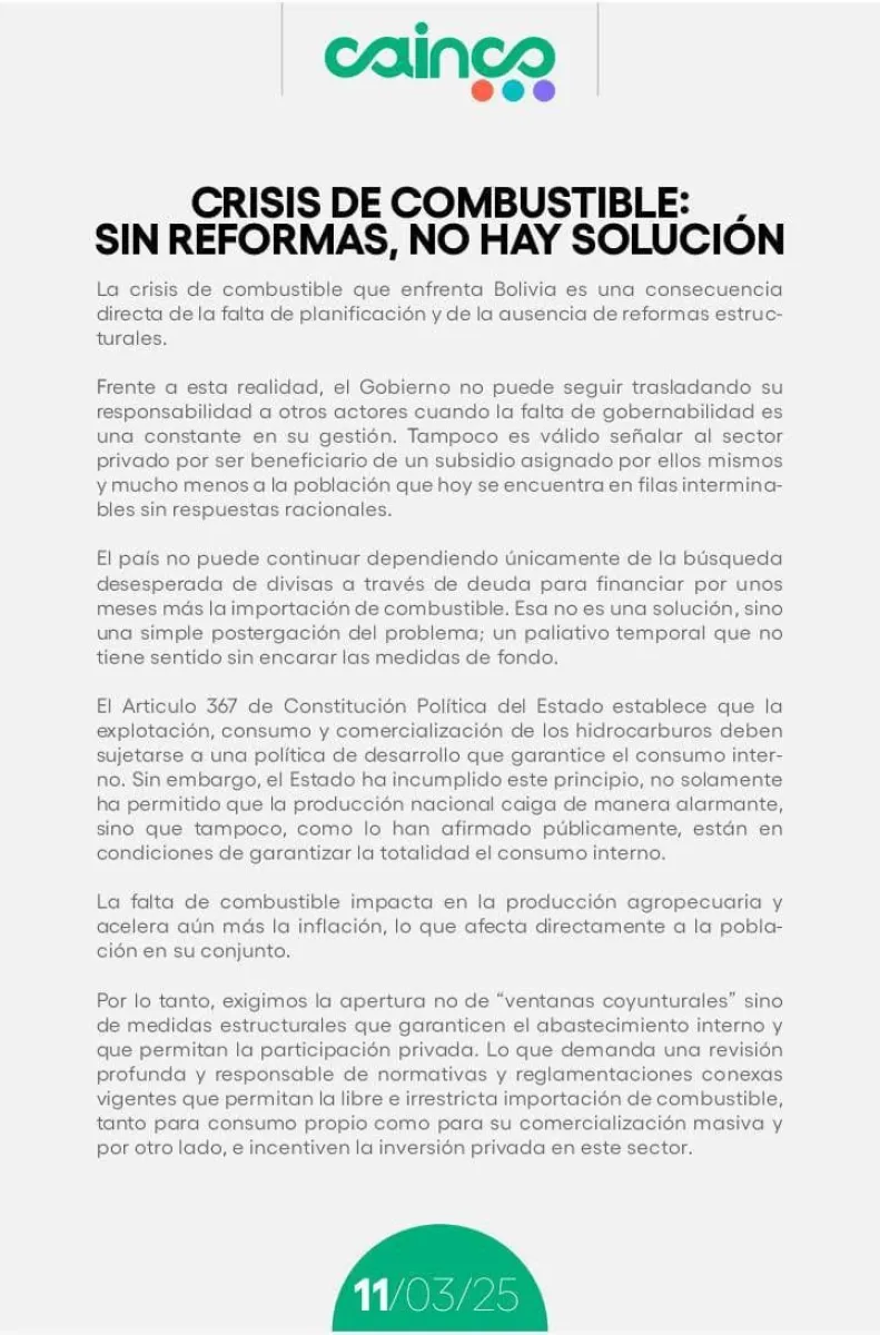 La Cámara de Industria, Comercio, Servicios y Turismo de Santa Cruz (Cainco) exigió este martes al Gobierno medidas estructurales que garanticen la provisión de combustibles en el mercado interno, las que, en su criterio, pasan por la revisión de la normativa, libre e irrestricta importación e incentivo a la inversión privada.
