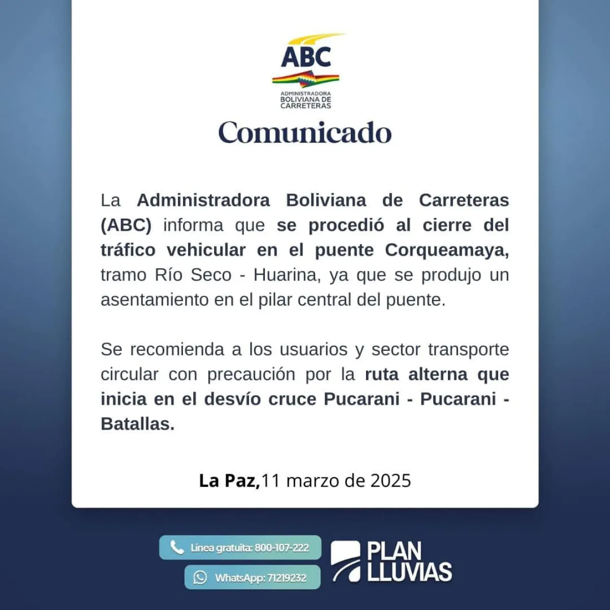 No fue el único. Y es que distintos reportes dan cuenta de que la circulación por esa senda fue cerrada la noche del martes. La Administradora Boliviana de Carreteras (ABC) informó que se procedió al cierre del tráfico vehicular en el puente Corqueamaya, tramo Río Seco Huarina, “ya que se produjo un asentamiento en el pilar central del puente”.