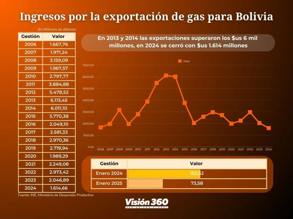 El problema es de dónde se conseguirán dólares para importar gasolina y diésel. Bolivia ya no tiene la principal fuente de divisas que era la exportación de gas, las ventas cayeron de $us 6 mil millones en 2014 a $us 1.114 millones en 2024.