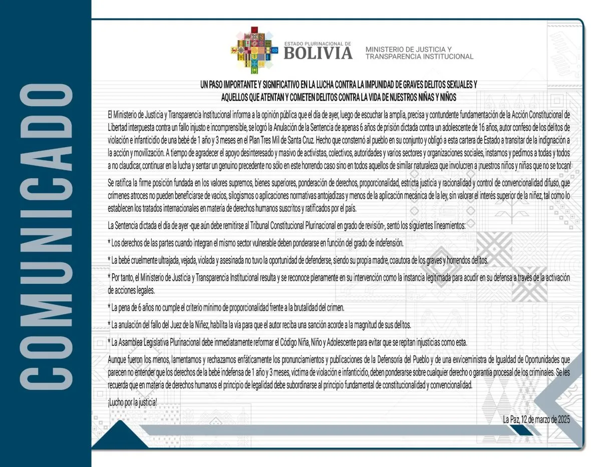 La Justicia anuló la sentencia de seis años que fue dictada en contra del adolescente que violó y asesinó a su hijastra de un año y tres meses de edad, en la zona del Plan Tres Mil, en la ciudad de Santa Cruz, según informó el Ministerio de Justicia.