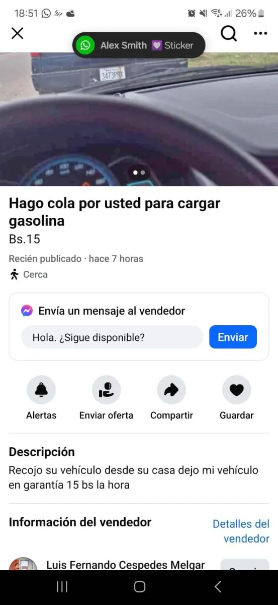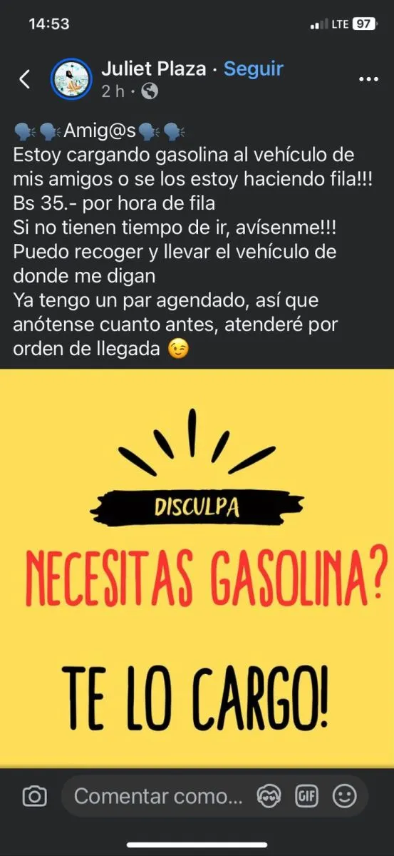 "¿Necesitas gasolina? Te lo cargo", "Hago cola para cargar gasolina por usted" o "La vida es eso que pasa mientras haces la fila para gasolina. Recojo tu auto, hago la fila, cargo gasolina y te llevo tu auto a tu casa u oficina", son algunas de las ofertas que desde hace unos días se pueden encontrar en las redes sociales. Son emprendedores que ofrecen hacer largas filas para conseguir combustible en La Paz.