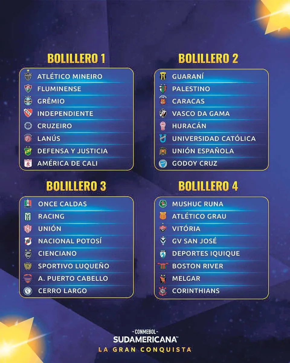 En el uno están Atlético Mineiro, Fluminense, Gremio, Independiente, Cruzeiro, Lanús, Defensa y Justicia, y América de Cali. Mientras que en el bolillero dos están Guaraní, Palestino, Caracas, Vasco da Gama, Huracán, Universidad Católica de Ecuador, Unión Española y Godoy Cruz.