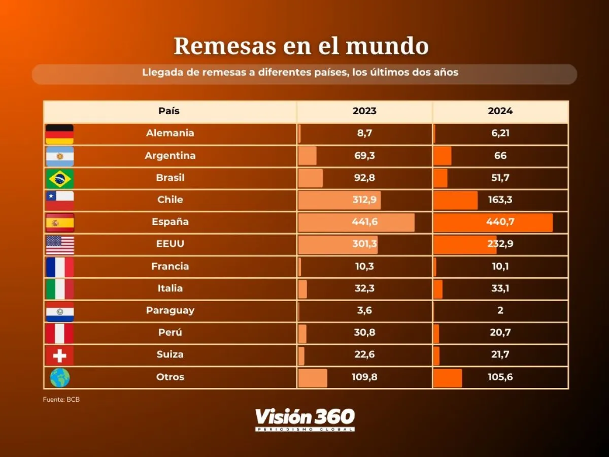 España es el país de donde más se recibe el dinero enviado por bolivianos a sus familias 440,7 millones de dólares en 2024, levemente inferior a los 441,6 millones de dólares que se registraron en 2023.