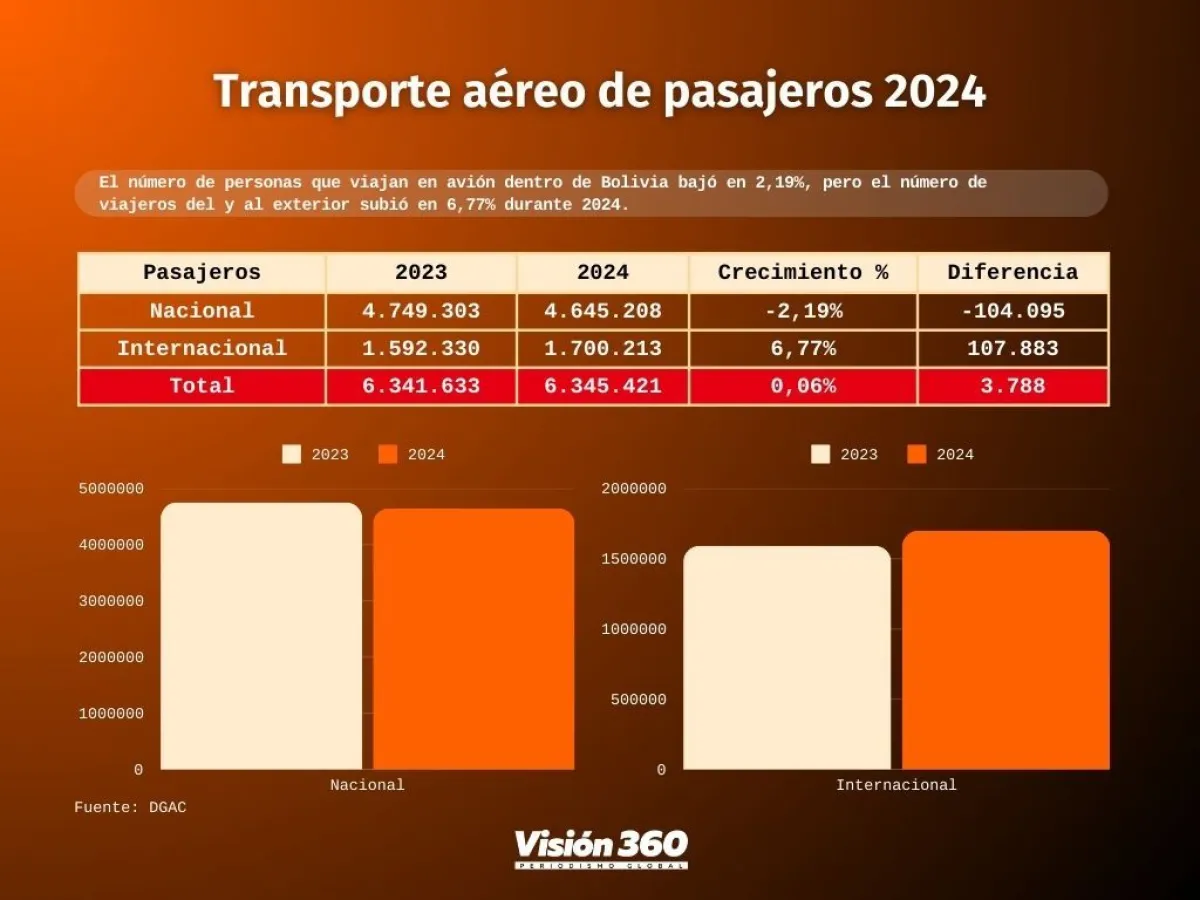 Las aerolíneas nacionales transportaron un menor número de pasajeros en 2024, respecto a la gestión 2023 (-2,19%), mientras que el flujo de viajeros movilizados al exterior aumentó en 6,77%, según datos de la Dirección General de Aeronáutica Civil (DGAC).