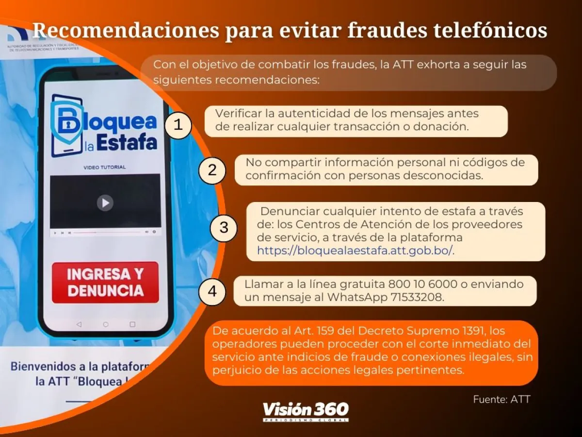 3.- Denunciar cualquier intento de estafa a través de los Centros de Atención de los proveedores de servicio, a través de la plataforma https://bloquealaestafa.att.gob.bo/, llamando a la línea gratuita 800 10 6000 o enviando un mensaje al WhatsApp 71533208.