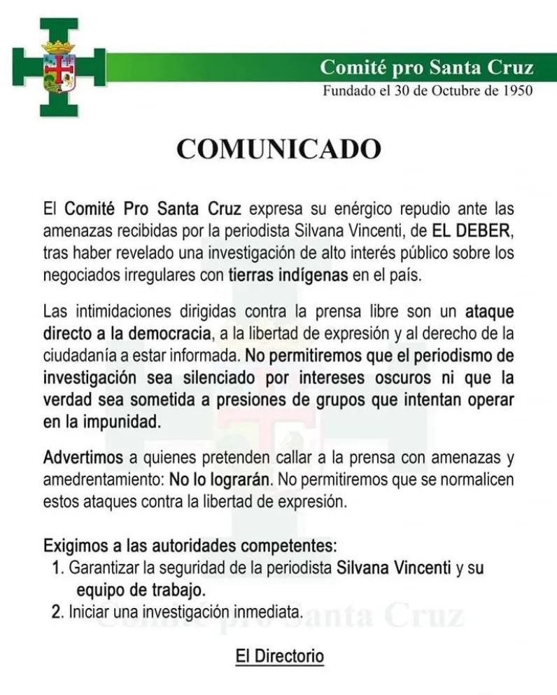 Ante esta situación, la Asociación Nacional de la Prensa (ANP), profesionales del periodismo e incluso el Comité pro Santa Cruz se manifestaron en apoyo a la investigadora y repudiaron las amenazas y exigen investigar los hechos.