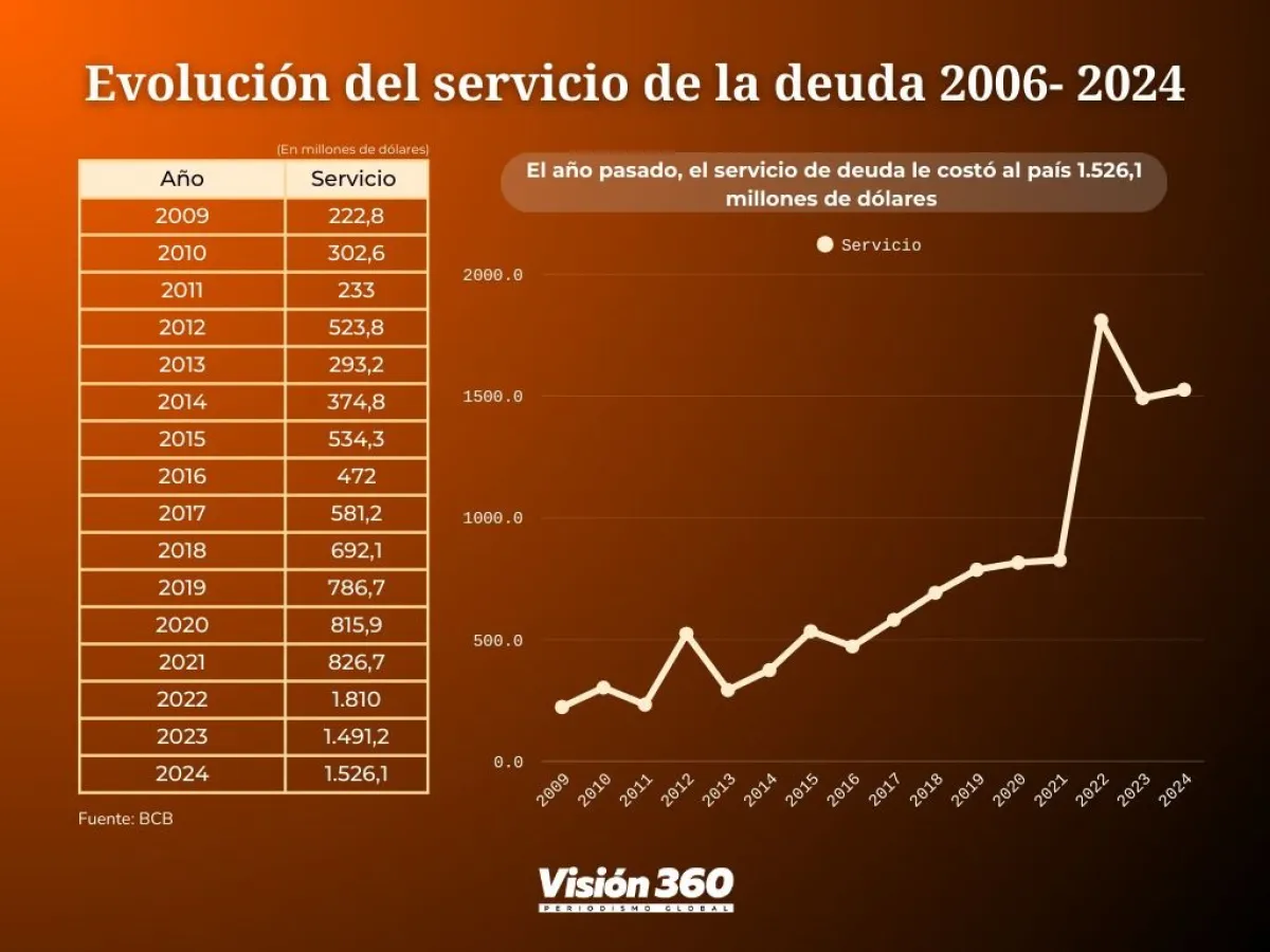 Bolivia, en 2009, apenas pagaba 222,8 millones de dólares por el servicio de la deuda (capital e intereses), pero en 2019 esta obligación aumentó a 786,7 millones y, en 2020, a 815,9, de acuerdo con cifras oficiales del Banco Central de Bolivia (BCB).