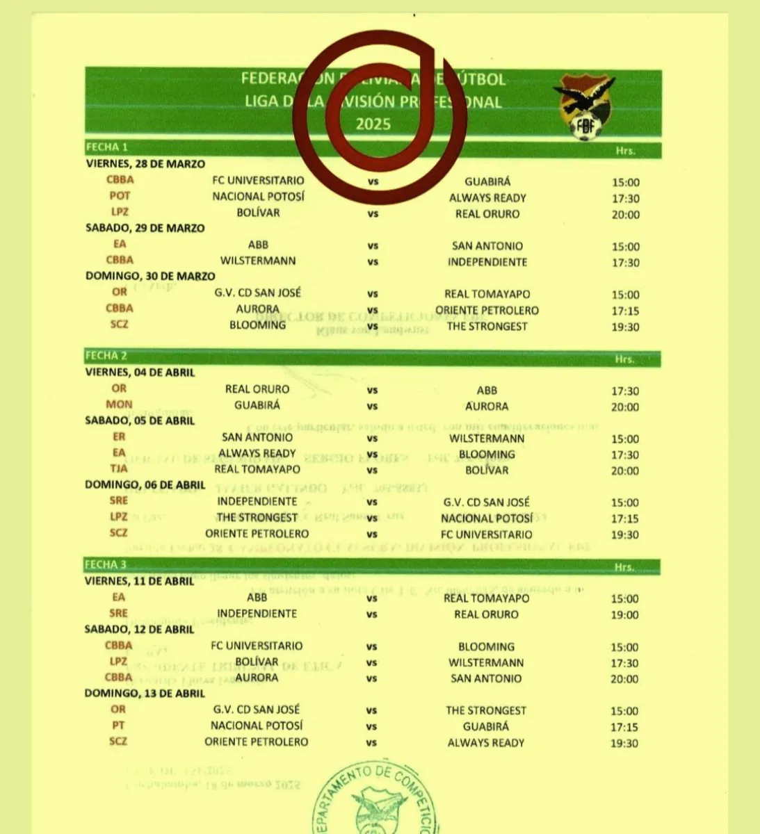 La Dirección de Competiciones de la Federación Boliviana de Fútbol (FBF) aprobó este miércoles días y horas de las primeras tres jornadas de ese campeonato que se iniciará el 28 de marzo.