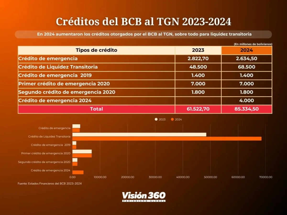 La entidad señala que el BCB concedió créditos excepcionales de emergencia y liquidez al Tesoro General de la Nación mediante el Ministerio de Economía y Finanzas Públicas, en el marco de lo establecido en el Artículo 22° y 23° de la Ley 1670.  Sólo en 2024, el saldo total aumentó de 61.522.708.246 bolivianos (61.522 millones), en 2023, a 85.334.527.896 bolivianos (85.344 millones) en 2024.