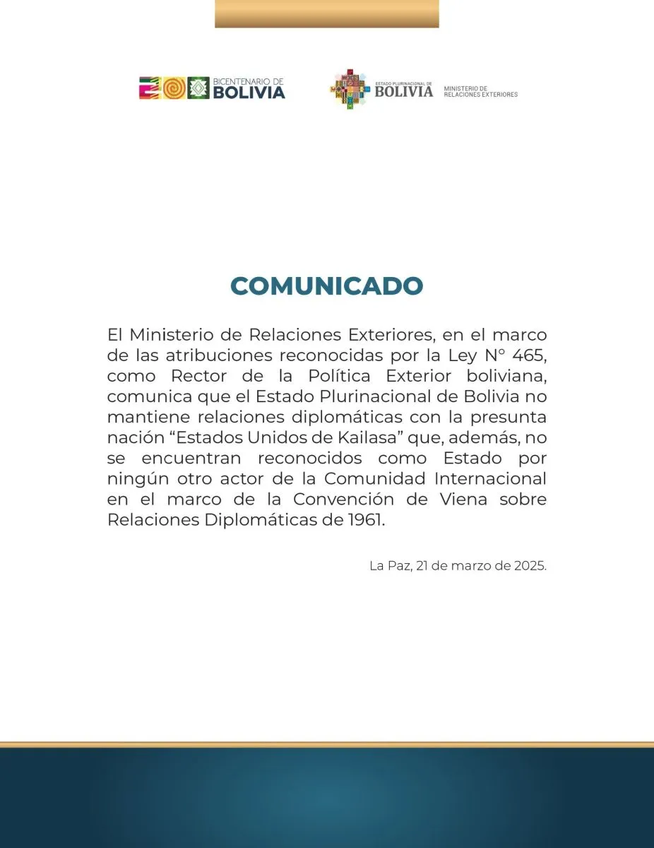 “El Ministerio de Relaciones Exteriores en el marco de las atribuciones reconocidas por la Ley N° 465, como rector de la política exterior boliviana, comunica que el Estado Plurinacional de Bolivia no mantiene relaciones diplomáticas con la presunta nación 'Estados Unidos de Kailasa' que además, no se encuentran reconocidos como Estado por ningún otro actor de la Comunidad Internacional en el marco de la Convención de Viena sobre Relaciones Diplomáticas de 1961”, se lee en el comunicado.