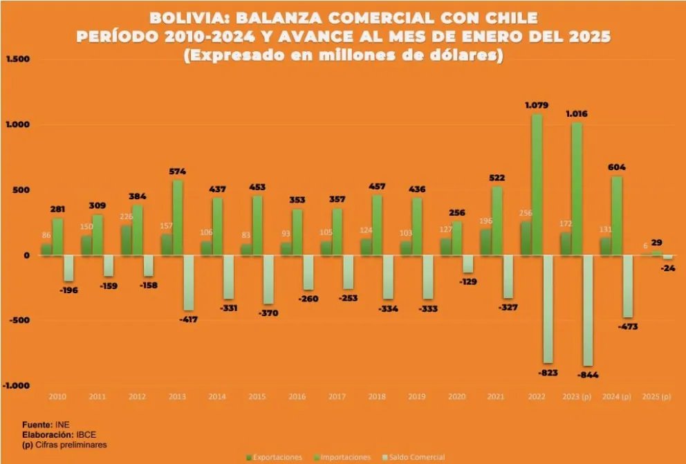 Cifras del Instituto Nacional de Estadística (Ine), procesadas por el Instituto Boliviano de Comercio Exterior (Ibce), revelan que la balanza comercial (exportaciones vs importaciones) con Chile históricamente ha sido negativa. En 2022 el déficit alcanzó un valor de 823 millones de dólares y, en 2023, otros 844 millones de dólares. El año pasado esto bajó a 473 millones de dólares por menores importaciones y, en enero de este año, llegó a 24 millones de dólares.