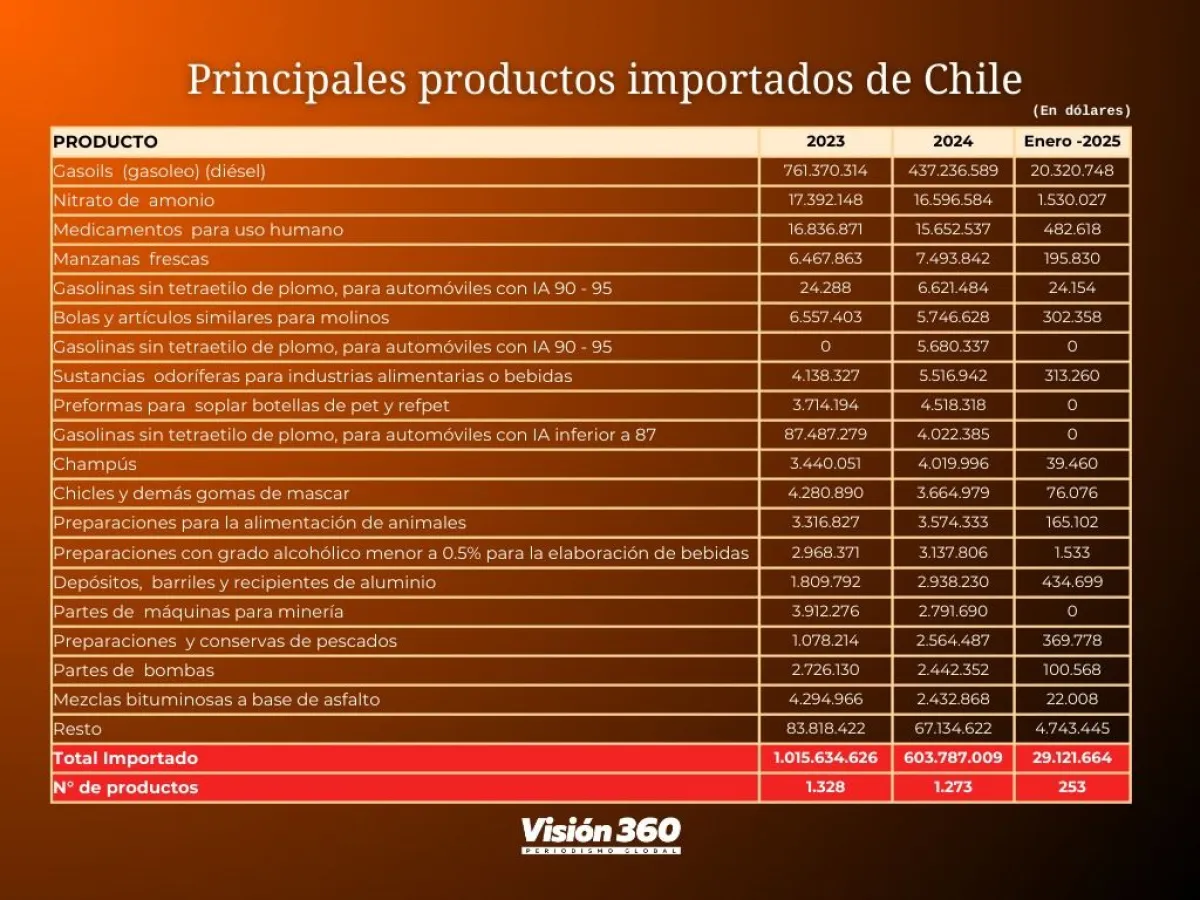 Por su parte, Bolivia importó desde Chile, diésel, nitrato de amonio, medicamentos, manzanas y gasolina por más de 483 millones de dólares. También se compra palmitos de ese país.