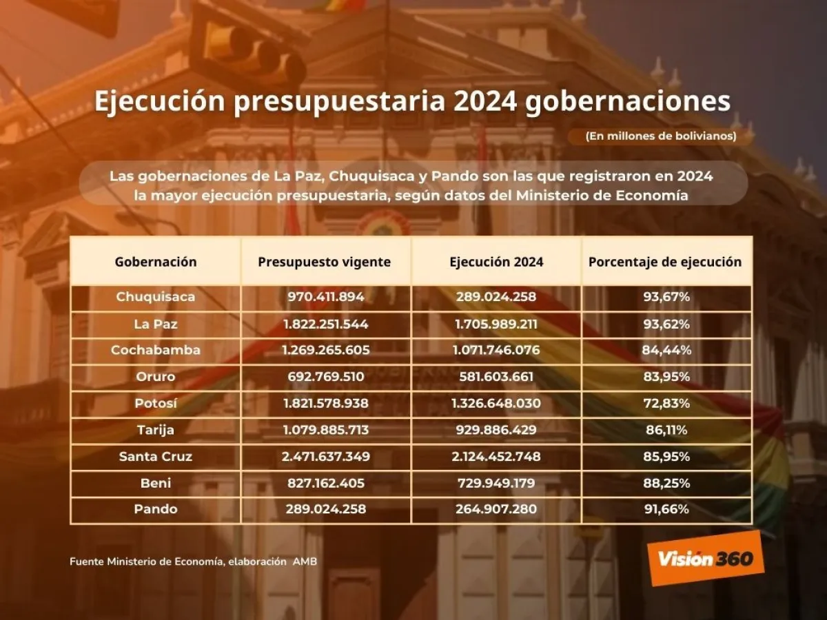 Lo datos consolidados de la gestión 2024 revelan que, por ejemplo, la Gobernación de La Paz recibió una asignación presupuestaria de 1.822,2 millones de bolivianos, y ejecutó el 93,62%; mientras que Chuquisaca tuvo un presupuesto de 970,4 millones de bolivianos y logró gastar el 93,67%.  En tanto, la asignación de Pando fue de 289 millones de bolivianos y su eficiencia fue de 91,66%.
