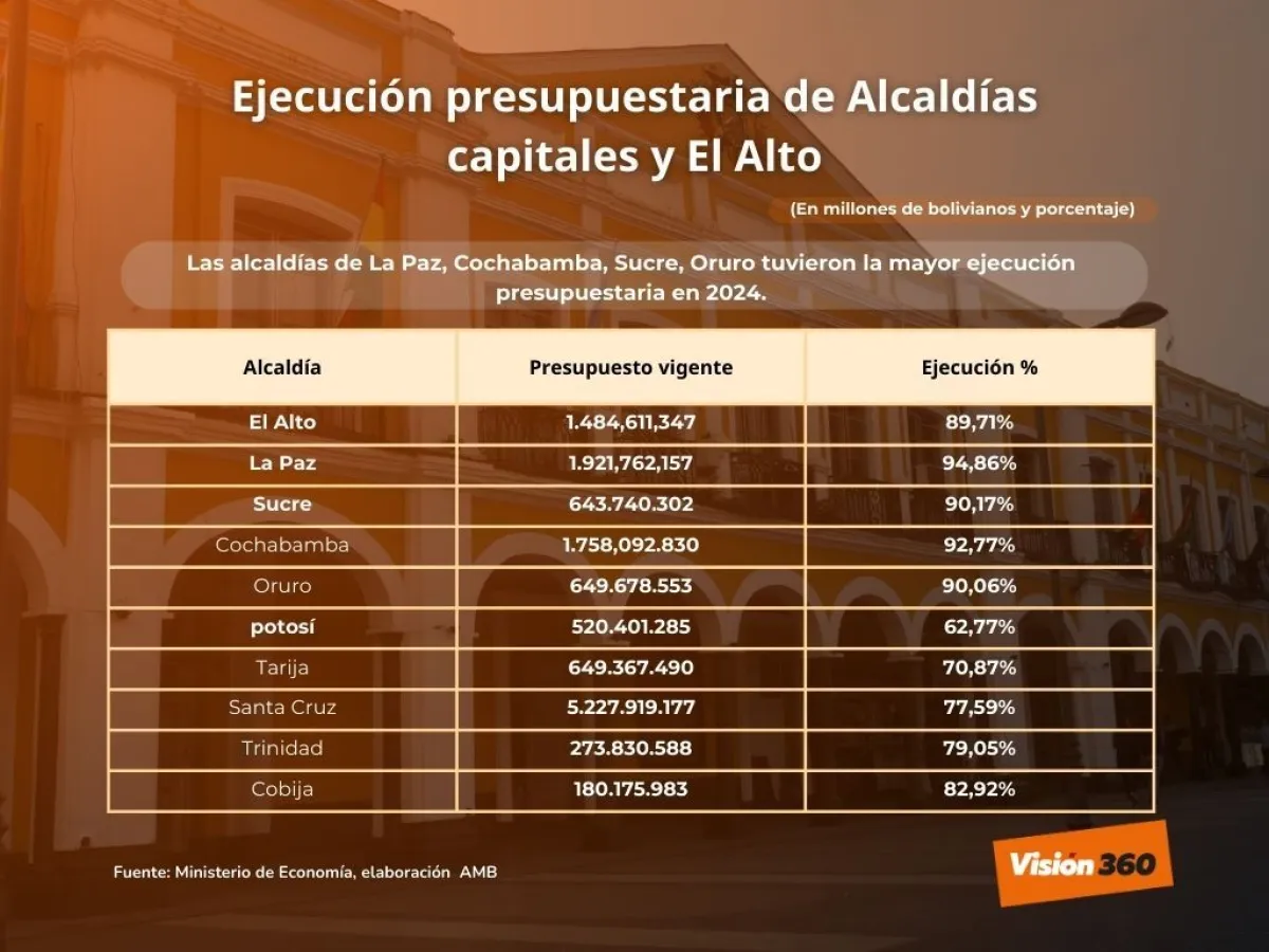 Los datos del ministerio de Economía, revelan que el año pasado la alcaldía de La Paz recibió un presupuesto de 1.823 millones de bolivianos  y la ejecución fue de 94,86%; luego se ubica Cochabamba, que tuvo una asignación de 1.758 millones de bolivianos y una eficiencia de  92,77%; en tercer lugar está la alcaldía de Sucre, con un presupuesto de 643,7 millones de bolivianos, ejecutó el 90,17%.