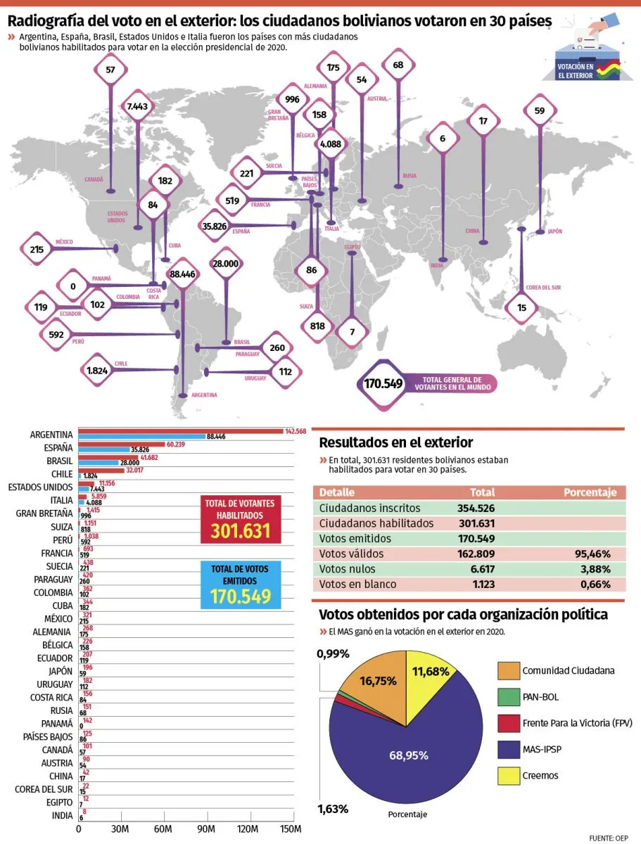 Argentina, España, Brasil, Estados Unidos e Italia concentran la mayor cantidad de ciudadanos bolivianos que emitieron su voto en el extranjero en los comicios presidenciales de 2020. Sin embargo, Argentina  registra el mayor número de  participantes, con un total de 88.446  votos emitidos en las elecciones generales de 2020.