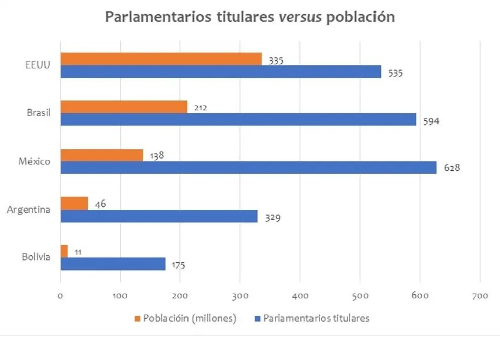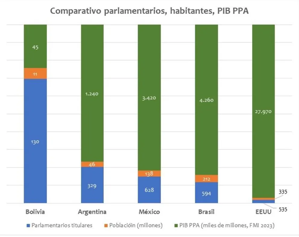 En la Asamblea Plurinacional hay 130 diputados (de 175 asambleístas titulares): 63 son uninominales y 60 plurinominales, además de siete “especiales” (ya he comentado qué pienso de esa discriminación inversa, pero saltémoslos ahora). Partamos que hay un diputado uninominal por cada circunscripción (no “especial”): por ende, representan a todo el país, mientras que los diputados plurinacionales —o “de lista”— sólo representan al partido y no a la circunscripción. Usted me dirá quizás: «Habla mucho de democracia pero está hablando de menos representantes ciudadanos…!» y a priori, sin ver números y con poca memoria, le diría (como algunos políticos entrevistados): «Mmmmm»; pero enseguida le recordaré lo que semanas antes publique: Argentina, con un PIB PPA que es (a 2023 por el FMI, gracias a los K) casi 10 veces del boliviano, tiene sólo menos del doble de congresistas titulares que nosotros para una población cuatro veces más. Para México, el PIB PPA es 75 veces más que el nuestro pero sus congresistas titulares sólo son más de 3,5 veces que Bolivia para una población más de 12 veces mayor. Respecto Brasil, su PIB PPA es casi 94 veces el de Bolivia pero sólo tienen menos de 3,4 veces congresistas titulares que nosotros para una población casi 19 veces mayor. Por último, EE.UU. tiene poco más de tres veces congresistas titulares que Bolivia —el 33 % menos que la comparación con Brasil— para una población casi 30 veces mayor. Pero como alguien puede decir justificadamente «¡es una jerigonza de números!», mejor hagámoslo gráficamente: