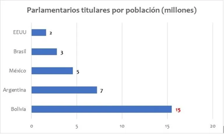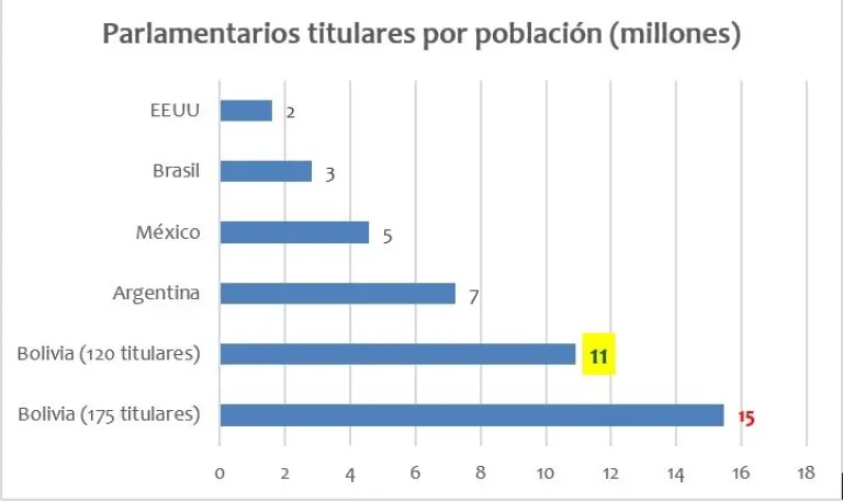 Lo que nos da una muy ineficiente proporción de asambleístas plurinacionales (uninominales + plurinominales) totales por millón de habitantes.
