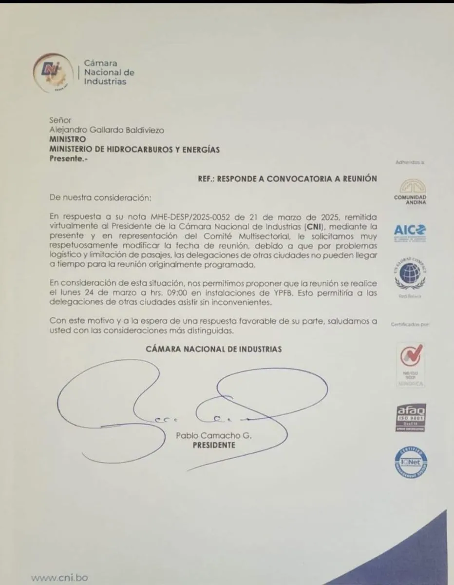 “Mediante la presente y en representación del comité multisectorial, le solicitamos muy respetuosamente modificar la fecha de reunión, debido a que por problemas logísticos y limitación de pasajes, las delegaciones de otras ciudades no pueden llegar a tiempo para la reunión originalmente programada”, dice la nota enviada por la CNI al ministro de Hidrocarburos, Alejandro Gallardo.