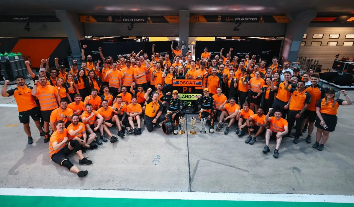 El equipo completo de McLaren festeja el 1-2 de sus pilotos en el Gran Premio de China. Foto: McLaren