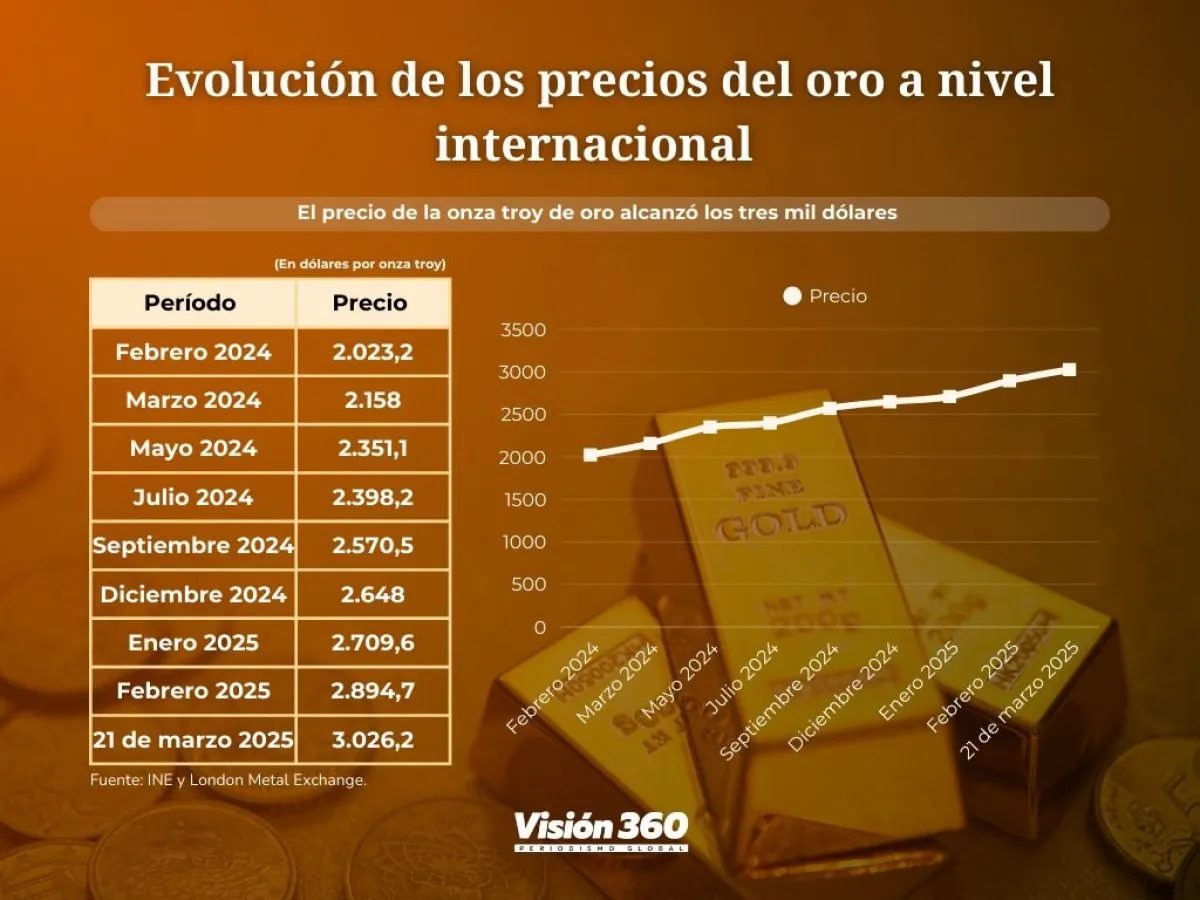 Datos procesados por el Instituto Nacional de Estadística (Ine) y el London Metal Exchange revelan que hace un año en febrero la onza troy se cotizaba en 2.023,1 dólares y en marzo 2.158 dólares, pero el 21 de marzo llegó a 3.026 dólares.