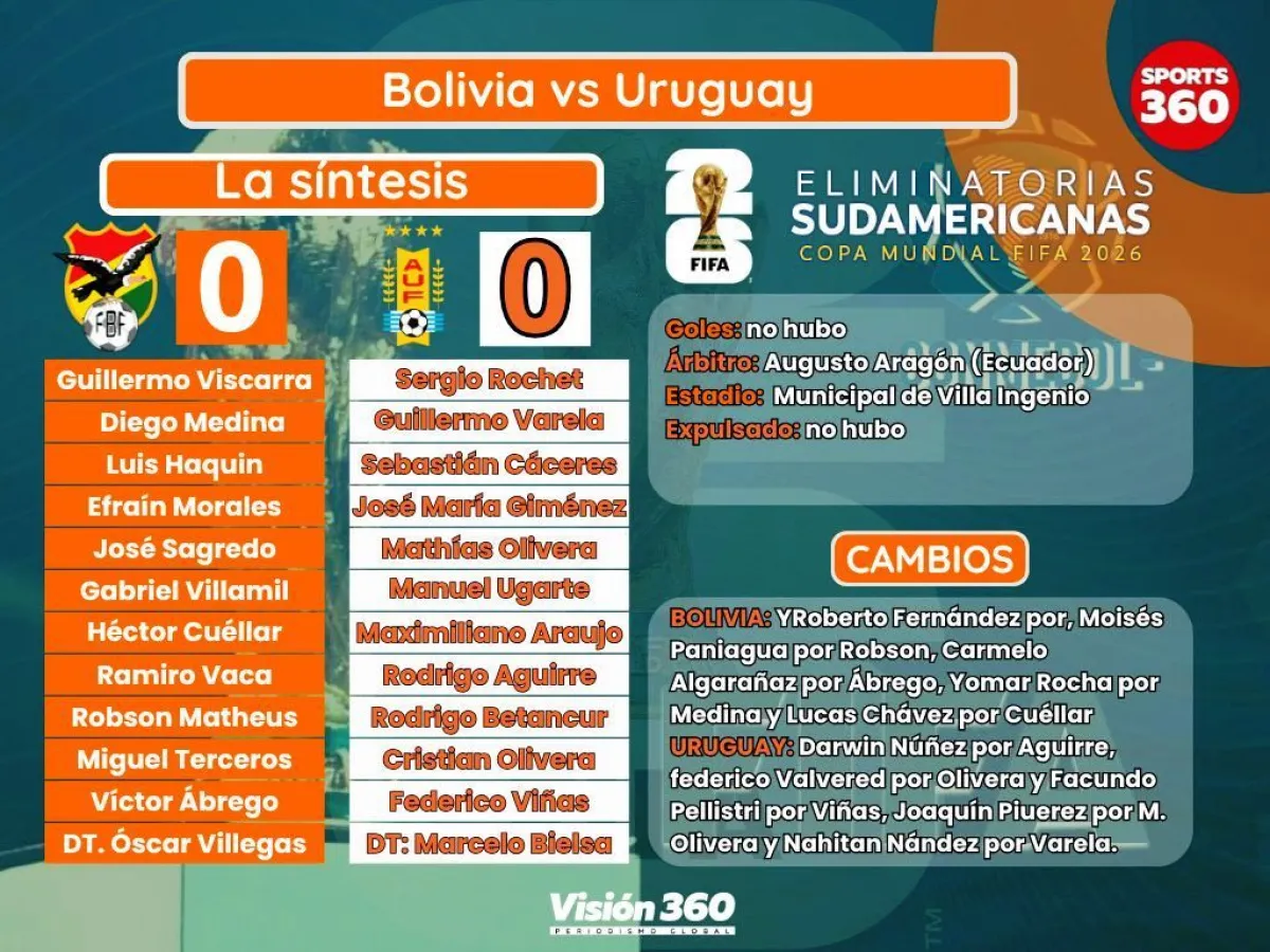 Bolivia chocó con una muralla uruguaya construida por el arquero Sebastián Rochet y solo pudo empatar 0-0 con Uruguay, este jueves en el estadio Municipal de Villa Ingenio, por la jornada 14 de las eliminatorias Mundial 2026.