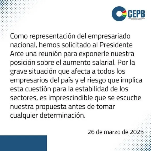 La Confederación de Empresarios Privados de Bolivia (CEPB) solicitó este miércoles una reunión al presidente Luis Are para tratar el aumento salarial de este año, “un tema que preocupa a todo el sector empresarial”.