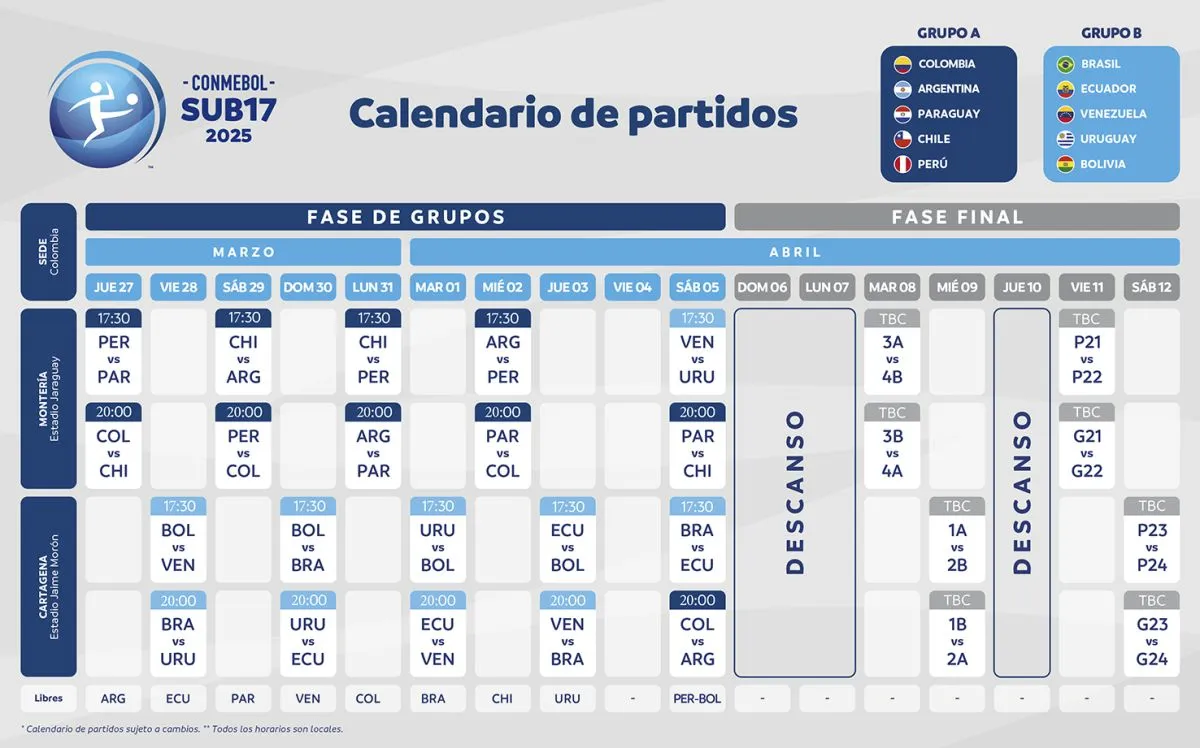 Dos días después, el domingo 30, el rival será Brasil; el martes 1 de abril jugará con Uruguay; finalizará la fase de grupos el jueves 3 enfrentando al seleccionado ecuatoriano.