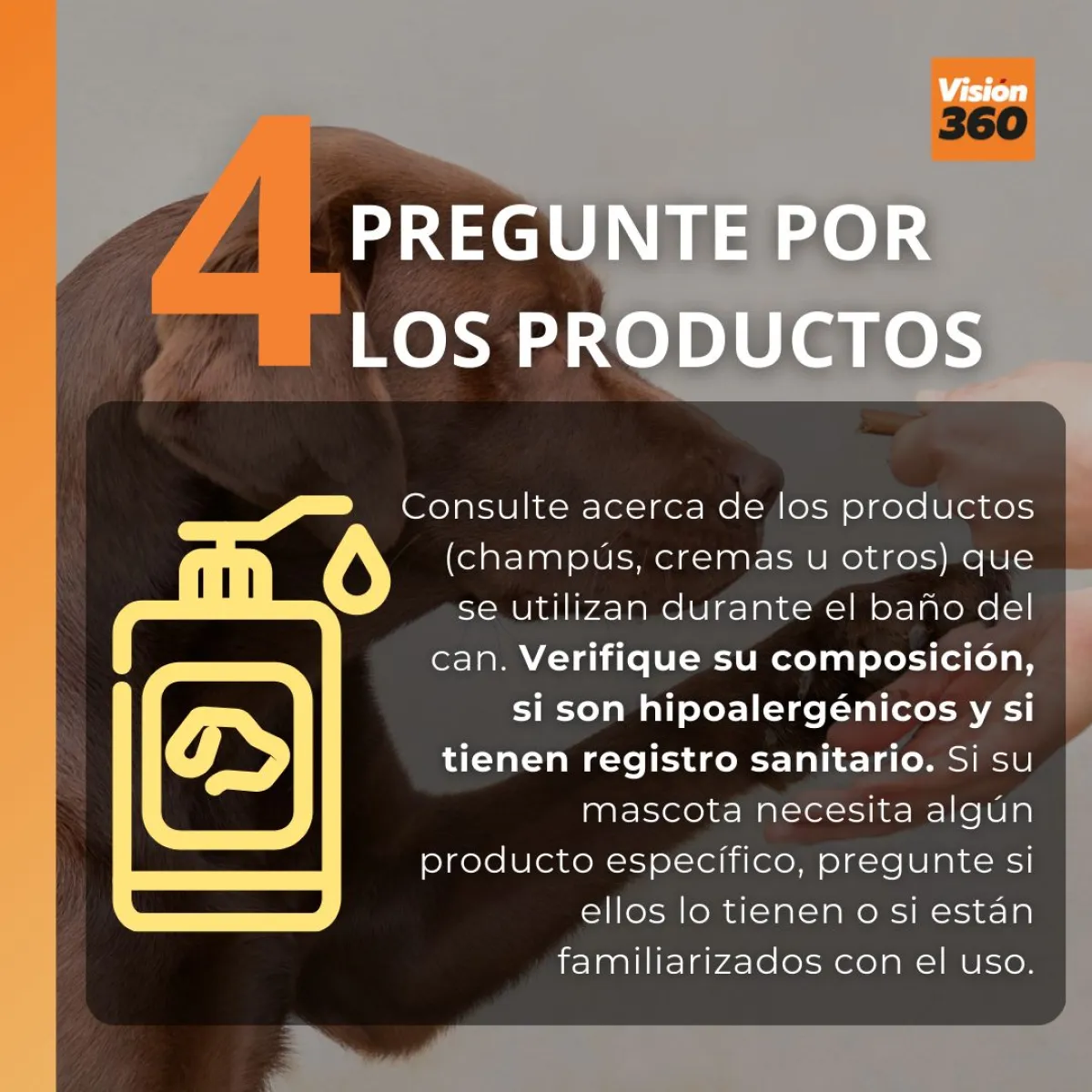 Consulte acerca de los productos (champús, cremas u otros) que se utilizan durante el baño del can, la limpieza de sus oídos o el acondicionamiento del pelaje.