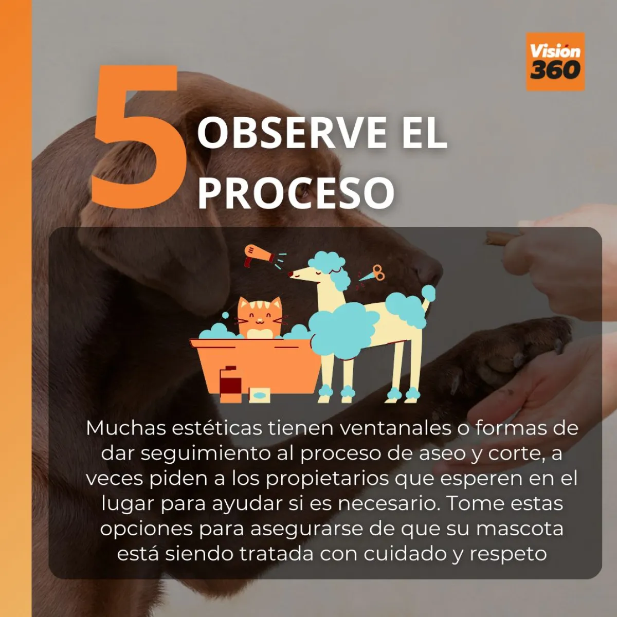 Muchas estéticas tienen ventanales o formas de dar seguimiento al proceso de aseo y corte, a veces piden a los propietarios que esperen en el lugar para ayudar si es necesario. Tome estas opciones para asegurarse de que su mascota está siendo tratada con cuidado y respeto.