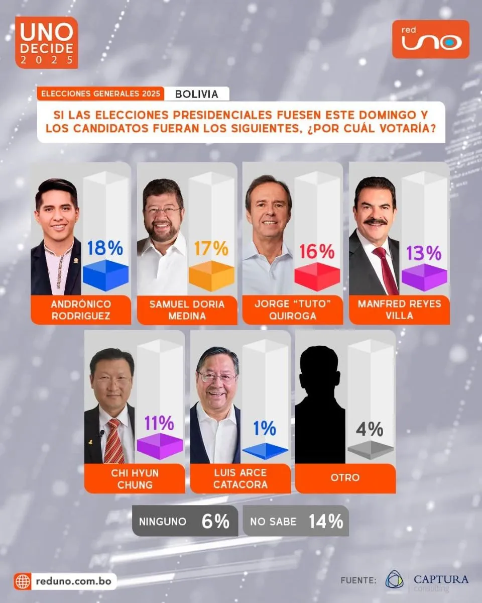 Una encuesta difundida en las últimas horas por Red Uno coloca a Rodríguez en el primer lugar de la intención de voto, con un 18%, seguido por Samuel Doria Medina, con 17%, Tuto Quiroga con el 16% y Manfred Reyes Villa con 13%. El presidente Luis Arce registra una preferencia del 1% (Ver cuadro).