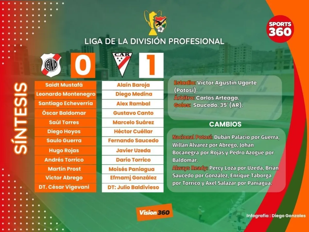 Con un gol olímpico de Fernando Saucedo a los 35 minutos del primer tiempo, Always Ready le ganó de visitante (0-1) a Nacional Potosí, en el debut de los dos equipos en el torneo de Liga de la División Profesional 2025.