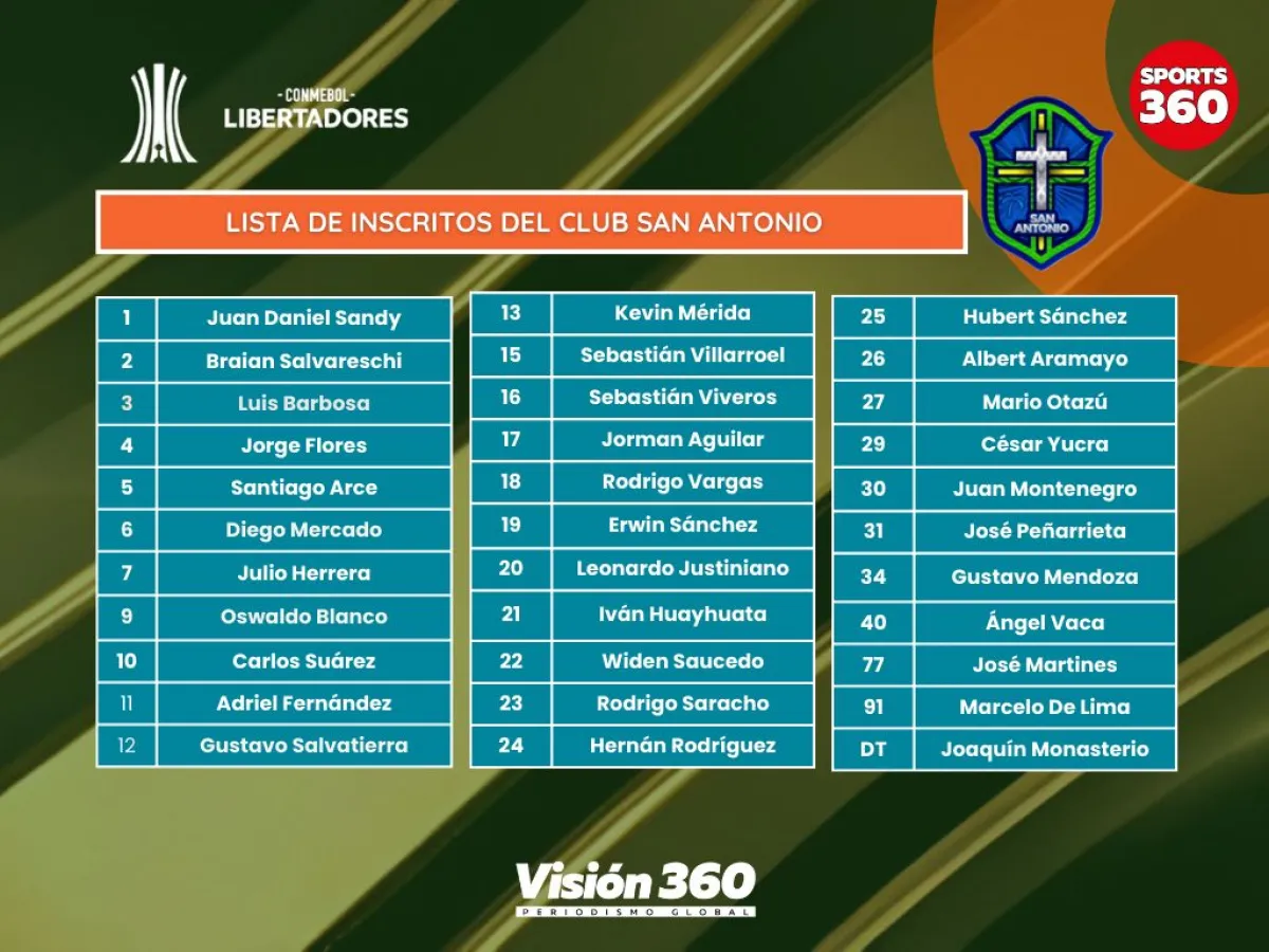 San Antonio registró 32 futbolistas para la fase de grupos de la Copa Libertadores de América, según la nómina difundida este sábado en la página de la Conmebol.