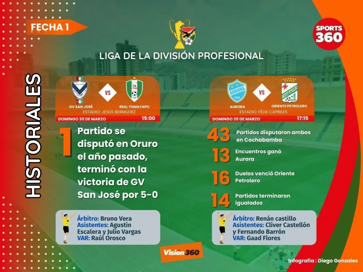 La jornada dominical comenzará a las 15.00 con el partido que sostendrán GV San José y Real Tomayapó en la capital de Pagador.
