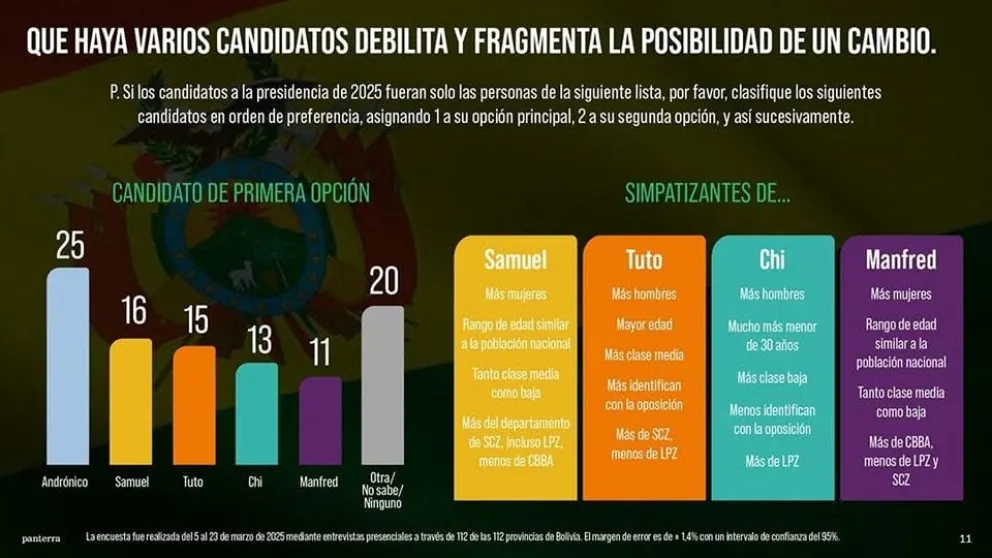 La encuesta financiada por Claure establece además que Jorge Tuto Quiroga llega a 15%, Chi Hyun Chung a 13% y Manfred Reyes Villa a 11%.