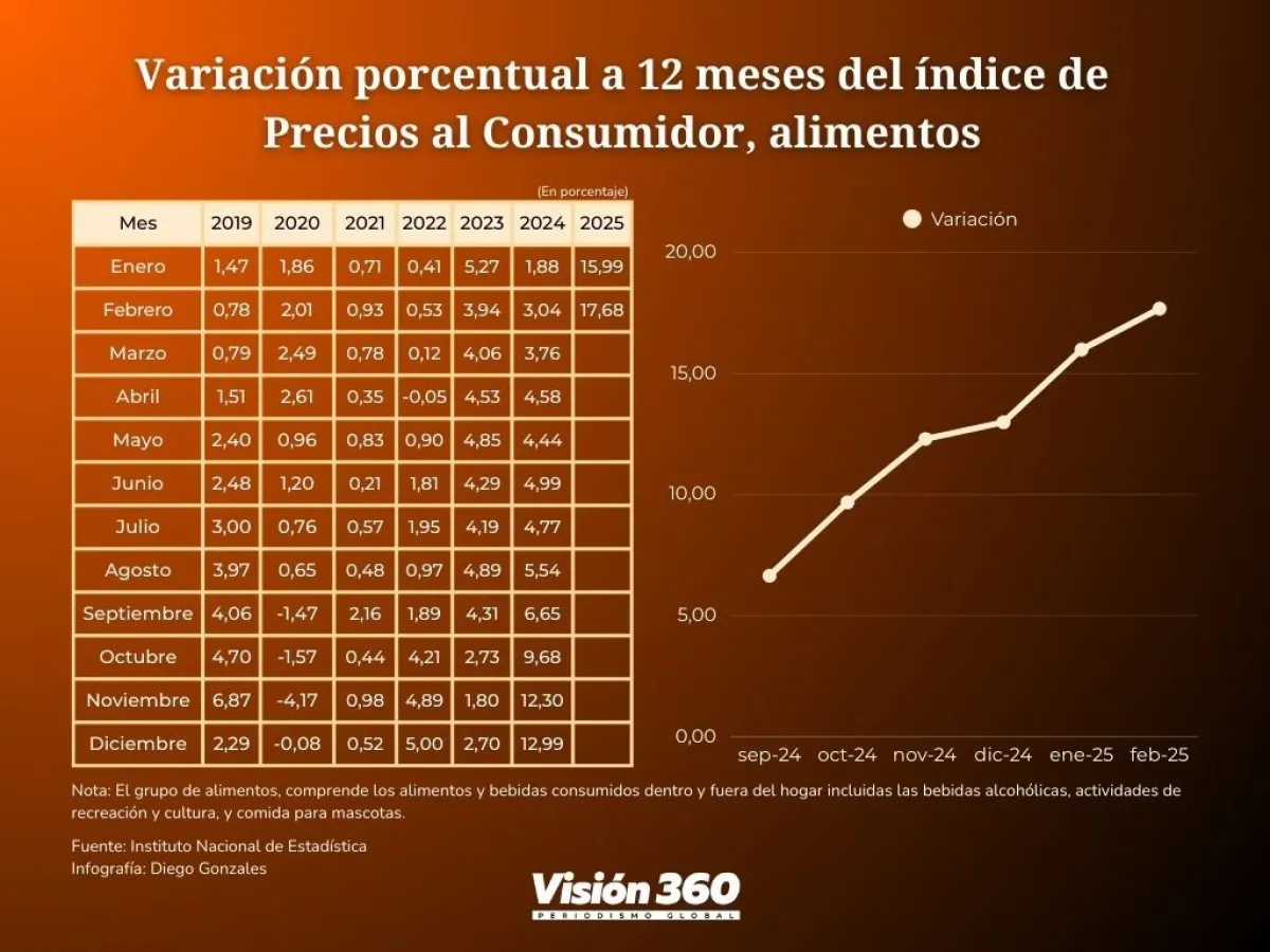 La inflación acumulada de alimentos en 12 meses, a febrero, fue de 17,68%, según el Instituto Nacional de Estadística (Ine) y el país soporta lluvias que no se habían presentado los últimos 40 años, situación que provocará en los próximos meses una mayor alza de precios y menor crecimiento económico por las pérdidas en el sector agrícola y ganadero, advierten analistas.