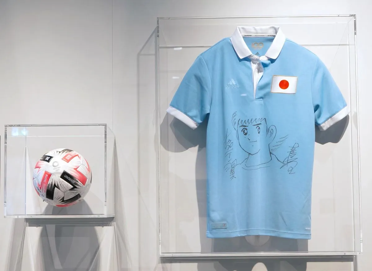 En la muestra, que se inaugura en coincidencia con el 44 aniversario de la primera aparición del manga que inspiró la serie animada, puede admirarse entre otros objetos una camiseta decorada con motivos de la serie, la que la selección nacional japonesa vistió en 2021 con ocasión de su centenario.