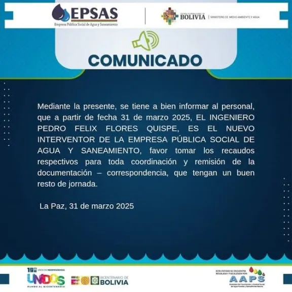 Pedro Flores Quispe fue nombrado interventor de la Empresa Pública Social de Agua y Saneamiento (EPSAS), según comunicó este lunes la empresa, mediante un comunicado que difundió en sus redes sociales.