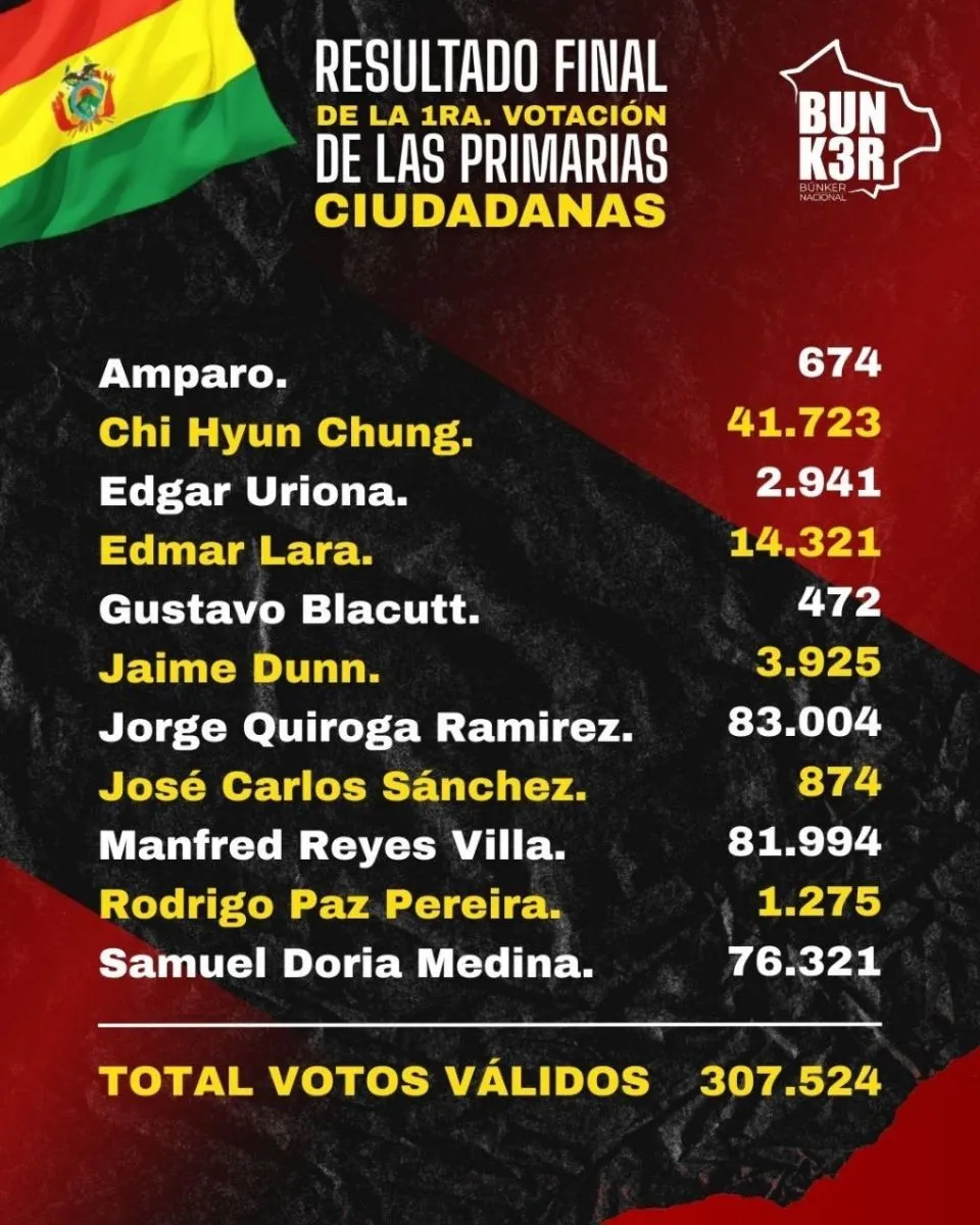 En estas “primarias digitales ciudadanas”, cuyo fin es el elegir un solo candidato opositor, Tuto Quiroga obtuvo 83.004 votos, seguido de cerca por Manfred Reyes Villa, con 81.994 votos, y el tercer lugar fue para Samuel Doria Medina, con 76.321 votos.