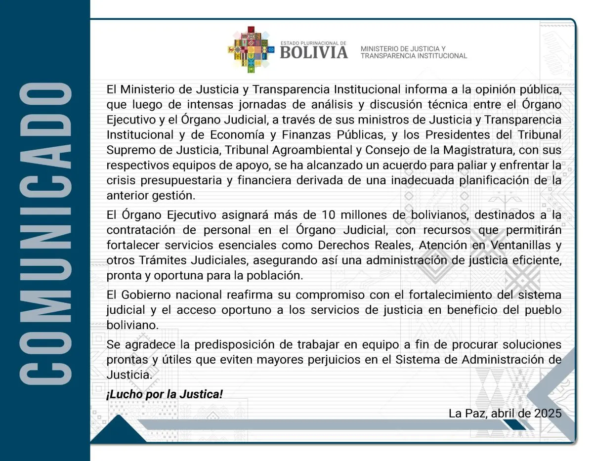 “El Gobierno nacional reafirma su compromiso con el fortalecimiento del sistema judicial y el acceso oportuno a los servicios de justicia en beneficio del pueblo boliviano”, señala el documento.