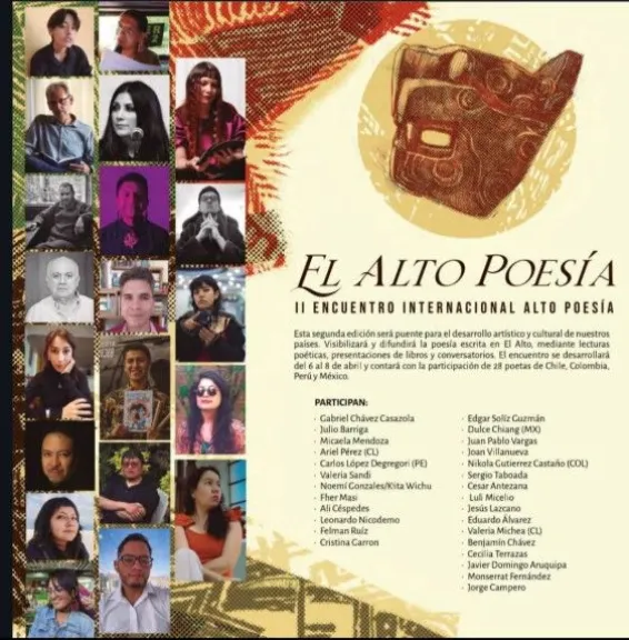 Veintiséis destacados poetas de México, Colombia, Perú, Chile y Bolivia serán los protagonistas del II Encuentro Internacional Alto Poesía, que se llevará a cabo del 4 al 6 de abril en la segunda Feria Internacional del Libro de El Alto. Esta propuesta, que busca hacer latir a El Alto al ritmo de la poesía, está organizada por Trueque Poético y la Cámara Departamental del Libro de La Paz.