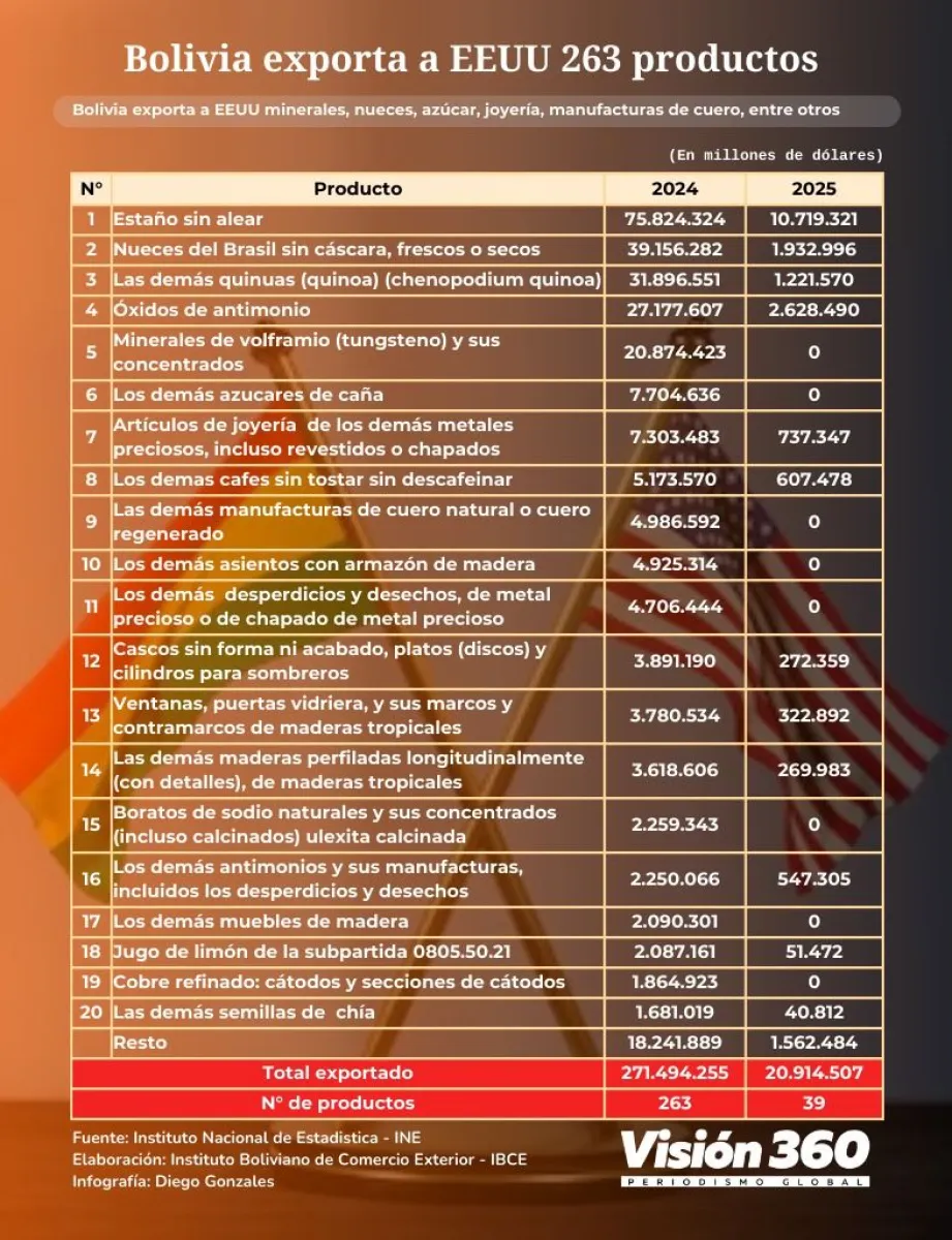 El gerente del Ibce, Gary Rodríguez, indicó a Visión 360 que Bolivia deberá pagar ahora un 10% de arancel, lo que afectará a sus exportaciones encareciéndolas. “Esto también podría hacer más difícil entrar a ese mercado, tanto para competir con la producción de ese país, en ciertos casos, así como con exportadores mejor posicionados geográficamente, con menores costos de logística y transporte”, precisó.